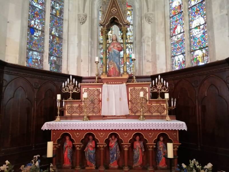 - Vitrail derrière la statue de St Anne décrivant l'enfance de la vierge Marie, est unique.