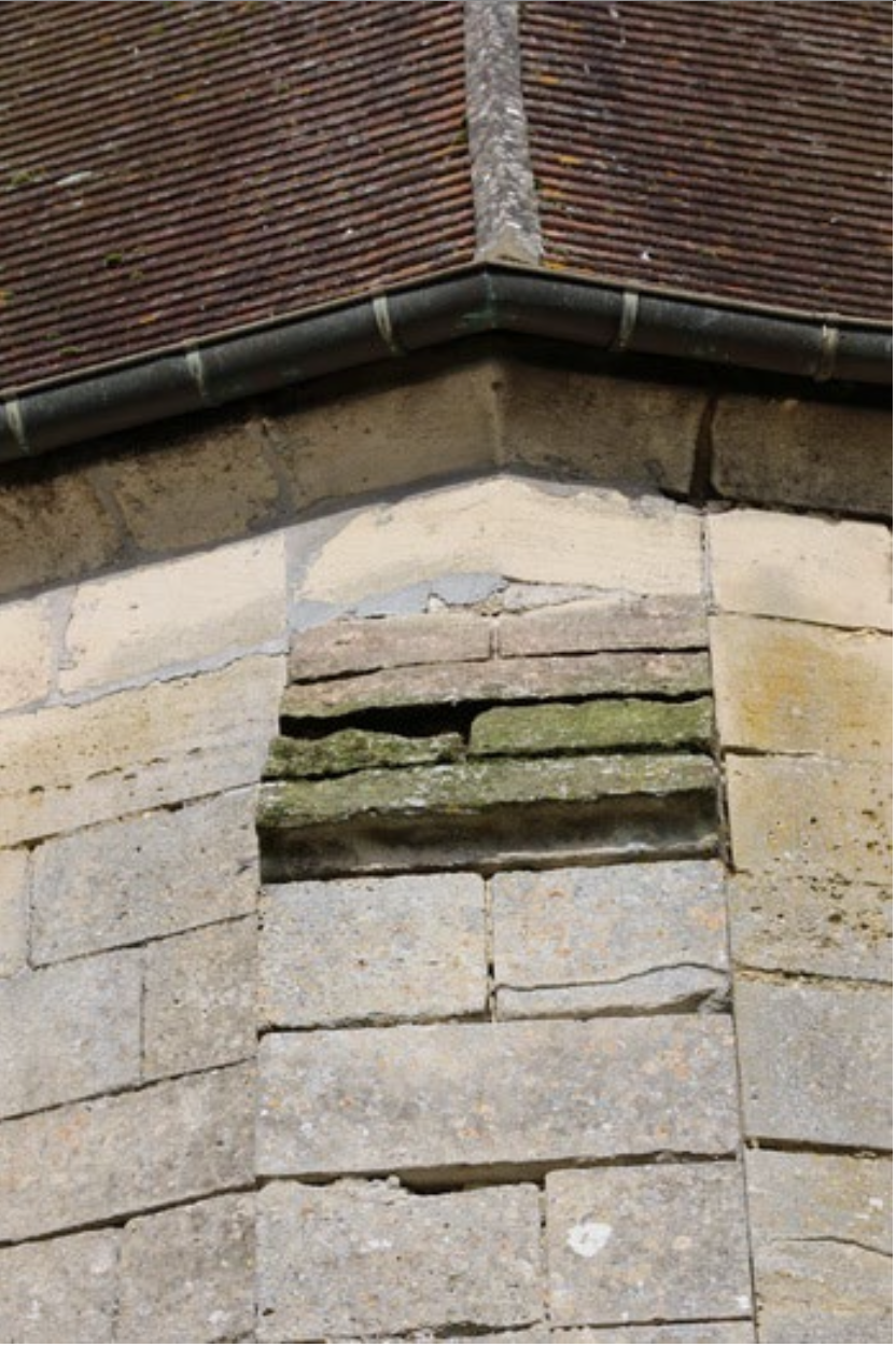 Les joints des maçonneries extérieures sont dégradés, favorisant l'infiltration d'eau et la détérioration progressive des pierres. Une reprise complète des joints est nécessaire pour assuré l'étanchéité et la stabilité de l'ensemble.