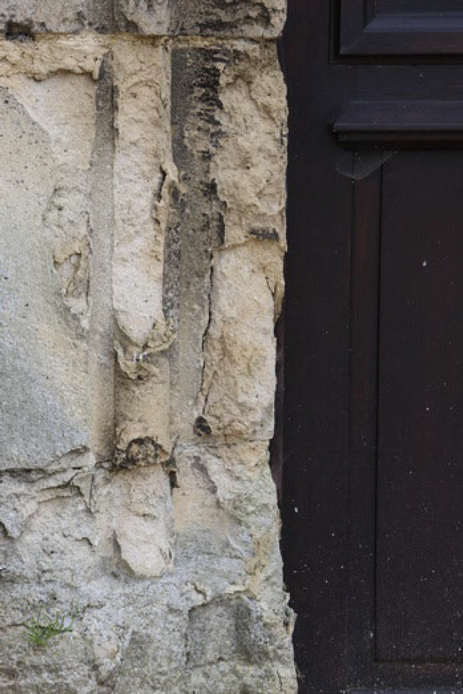 Les pieds des murs présentent un déchaussement notable, ce qui fragilise la structure globale de l'édifice et peut entraîner des désordres supplémentaires si aucune intervention n'est réalisée.